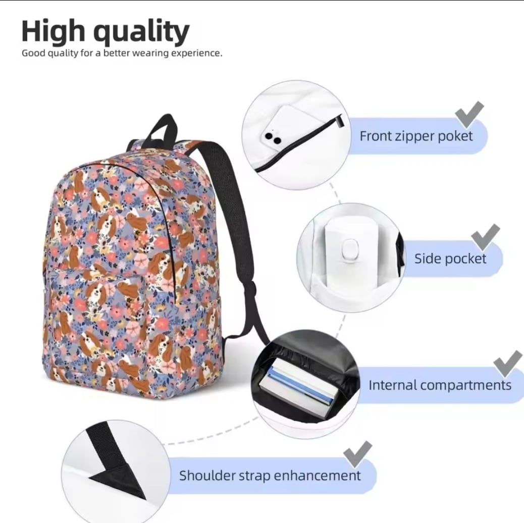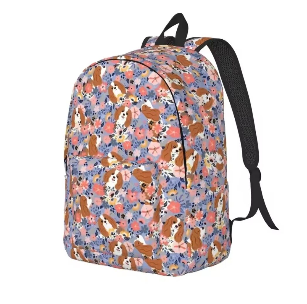 パープル地にブレンハイムのキャバちゃんとお花が描かれた可愛いリュックサックです!
